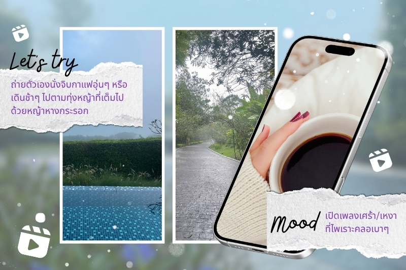 • มุมกล้อง: ถ่ายตัวเองนั่งจิบกาแฟอุ่นๆ หรือเดินช้าๆ ไปตามทุ่งหญ้าที่เต็มไปด้วยหญ้าหางกระรอก