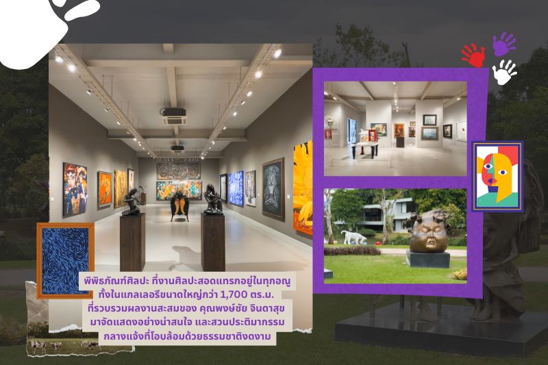 บนพื้นที่กว่า 20 ไร่แห่งนี้ ไม่ได้เป็นเพียงแค่พิพิธภัณฑ์ศิลปะ แต่เป็นอาณาจักรที่งานศิลปะสอดแทรกอยู่ในทุกอณู ทั้งในแกลเลอรีขนาดใหญ่กว่า 1,700 ตร.ม. ที่รวบรวมผลงานสะสมของ คุณพงษ์ชัย จินดาสุข มาจัดแสดงอย่างน่าสนใจ และสวนประติมากรรมกลางแจ้งที่โอบล้อมด้วยธรรมชาติงดงาม